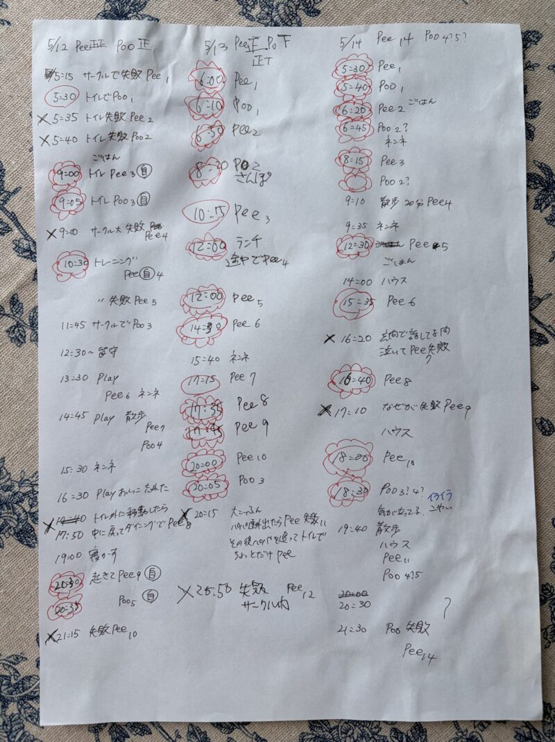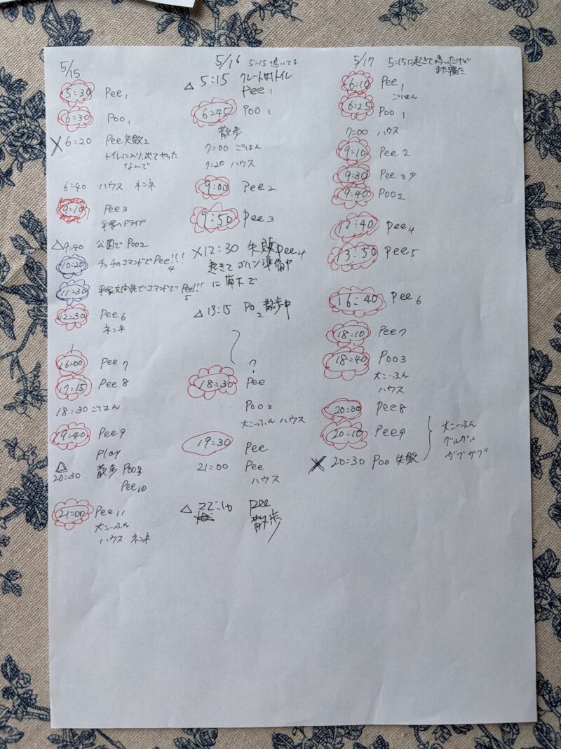 トイレ外でしてしまったら「❌」、散歩中は「🔺」、トイレに連れてってできたら「花丸」というようにメモしました。