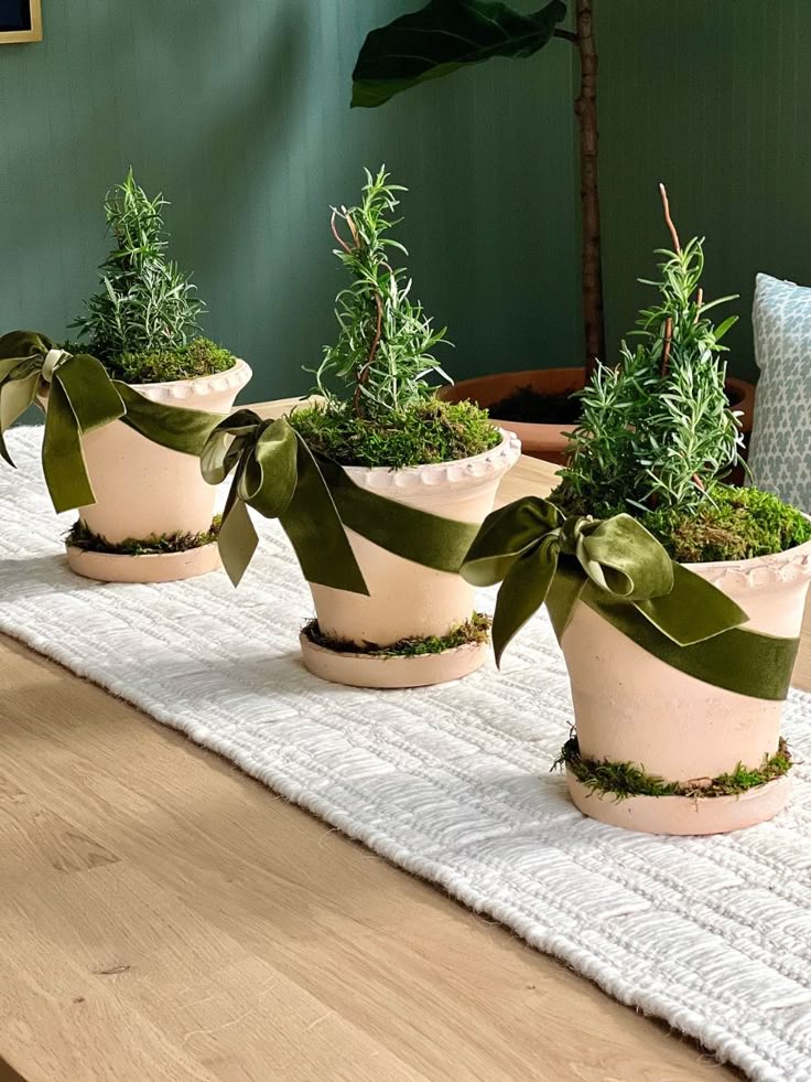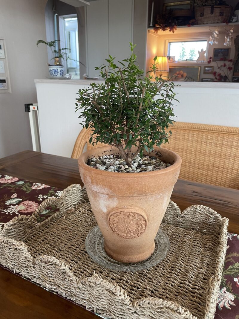 でも本当は、お安く購入した常緑低木とテラコッタの鉢、拾ってきたドングリの実や手持ちのリボンなどを巻き付けるだけでできてしまうんです。